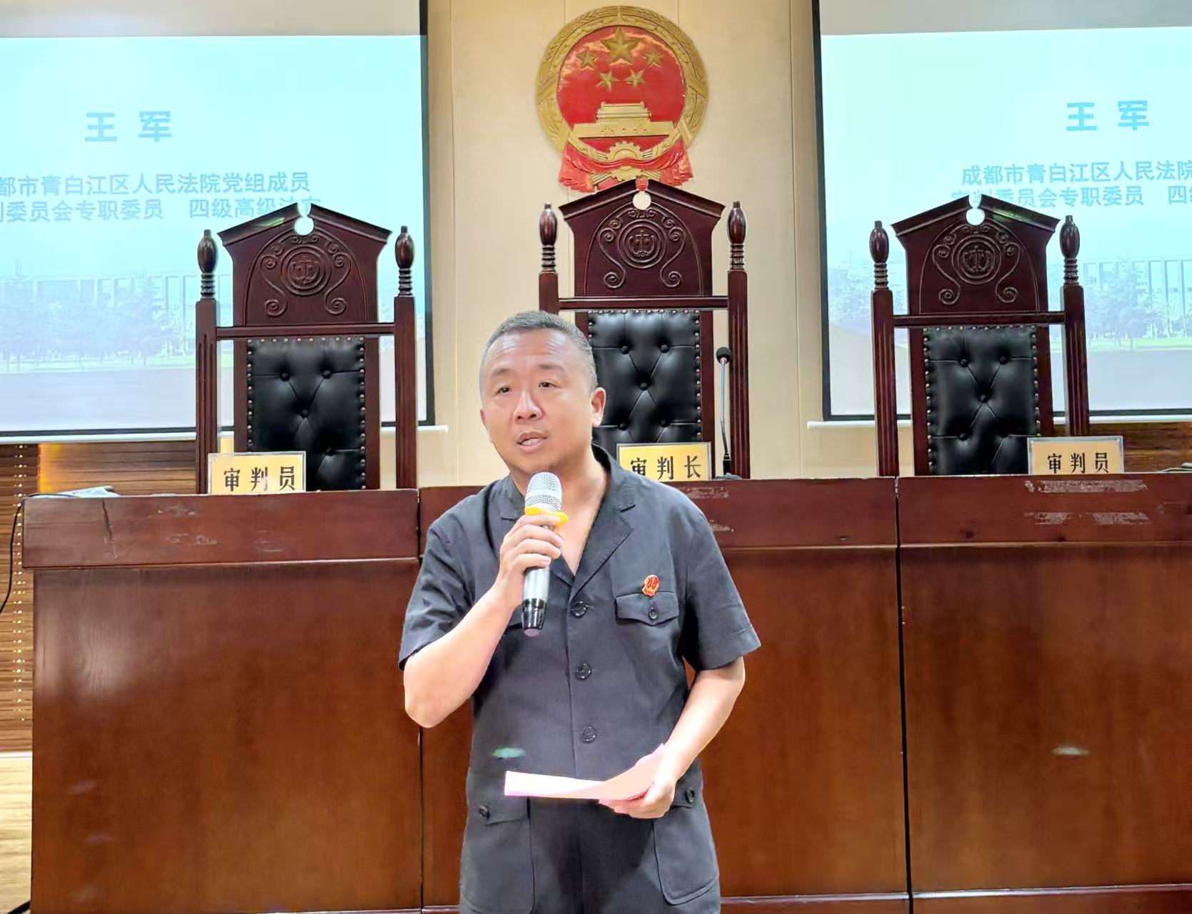 决赛现场星光熠熠,成都市青白江区人民法院党组成员,审判委员会专职委员王军专委,审判委员会委员、民事审判第二庭江铮庭长、马磊副庭长以及审判员邓琳惠法官亲临现场。新葡的京集团35222vip法学系党支部书记刘鑫教授,法学系系主任魏琼副教授以及法学系程馨桥副教授也来到现场,为参赛人员加油助威。审判专家的到来点燃了现场的竞赛氛围,也让这场模拟法庭竞赛更具专业性和精彩度。
