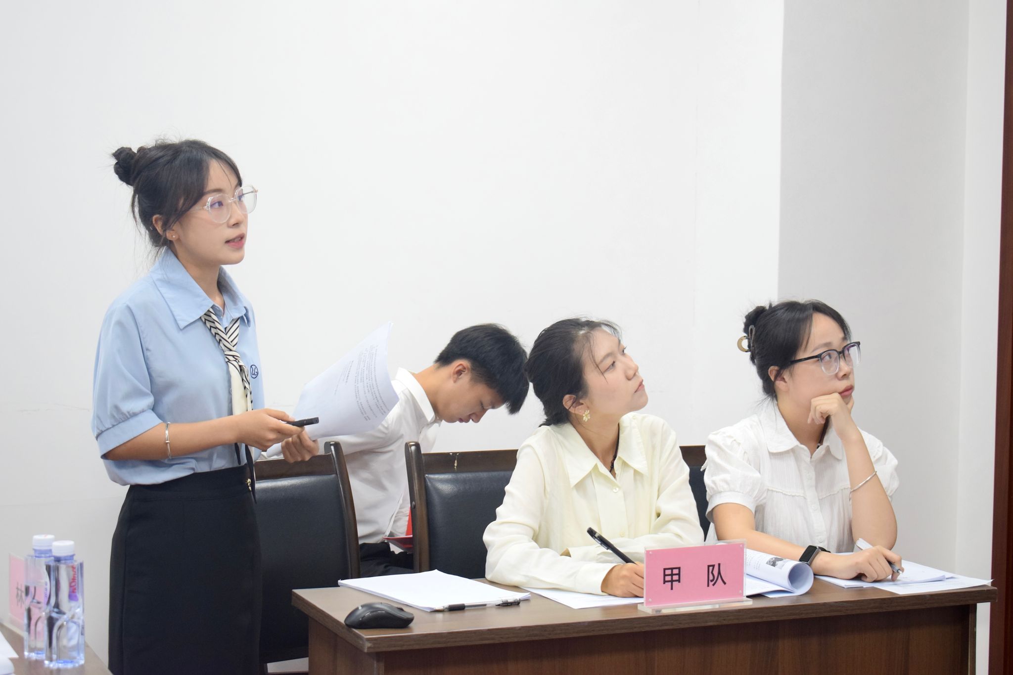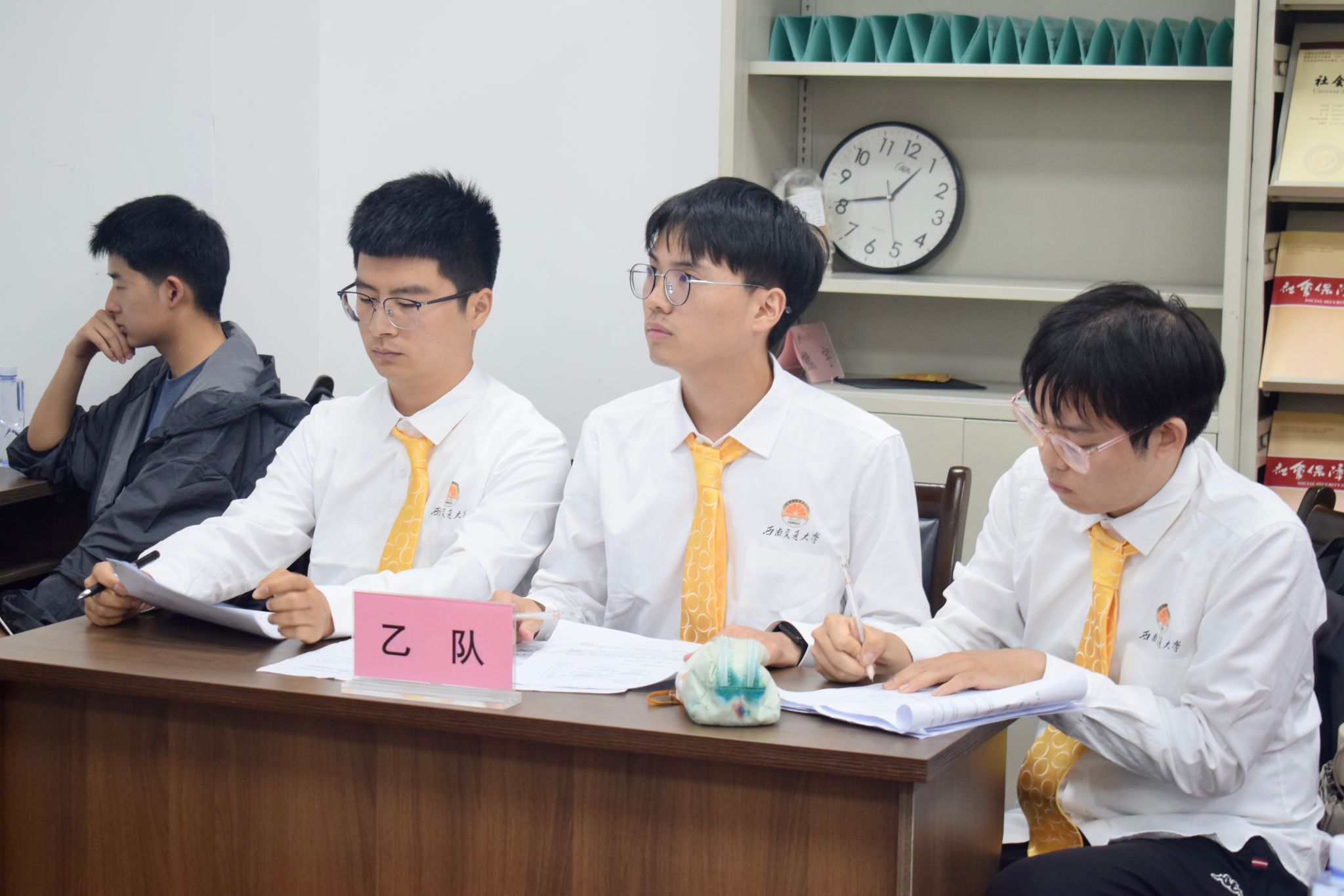 同一时间的01112赛场,率先登场的是“满天稀小队”和“乘坐公交请排队”。“满天稀小队”聚焦成都市金堂县三溪镇,探索当地创建农村物流品牌“交商邮融合”的可行性,“乘坐公交请排队”肯定该队调研广度的同时,也对其调研深入程度做出建议;接着,“乘坐公交请排队”从政策势能视角出发,阐述金堂县公交改革的惠民效果,而“满天稀小队”则对其政策执行的扩散程度和评估标准展开提问。第二场比赛中,“顶呱呱队”研究新津区“社会救助通”的推行模式并论证这一举措对提升社会救助服务可及性的效果,“三个臭皮匠队”提出对方案例缺乏公共性的问题;之后,“三个臭皮匠队”基于三鱼萌狮文化村分析了乡村文化资源的价值实现机制,而“顶呱呱队”向对方的调研结果提出疑问,指出对方理论与案例匹配度较低。几次交锋中,队员们出色的案例分析能力和临场反应赢得了评委和观众的掌声。