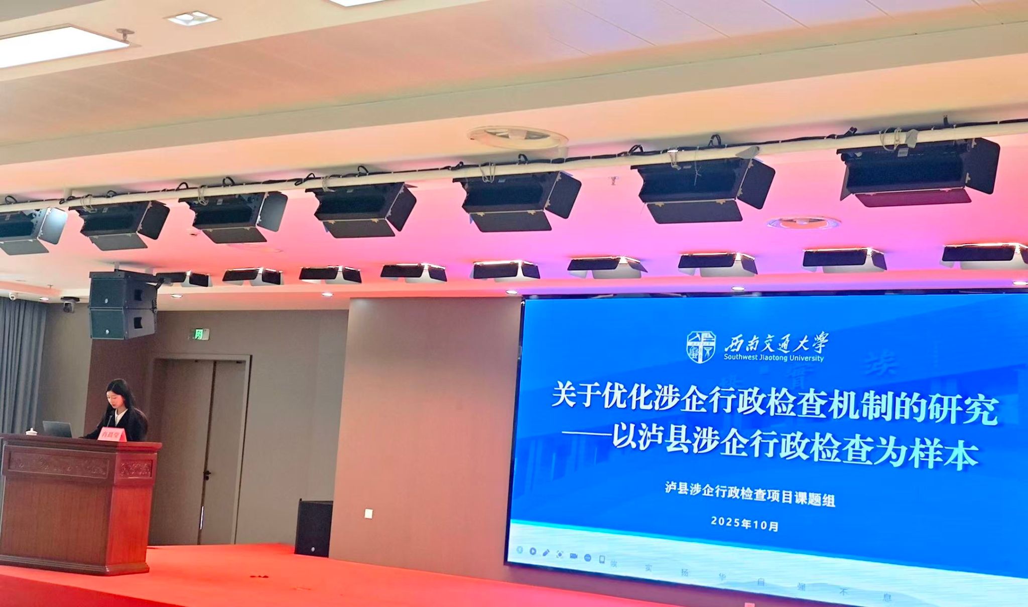 专题交流中,六位获奖作者围绕行政复议、行政诉讼等议题发言。新葡的京官网法学硕士研究生肖晨莹代表联合课题组就获奖论文做学术报告,结合泸县调研数据阐述涉企行政检查困境及优化建议,获现场专家认可。