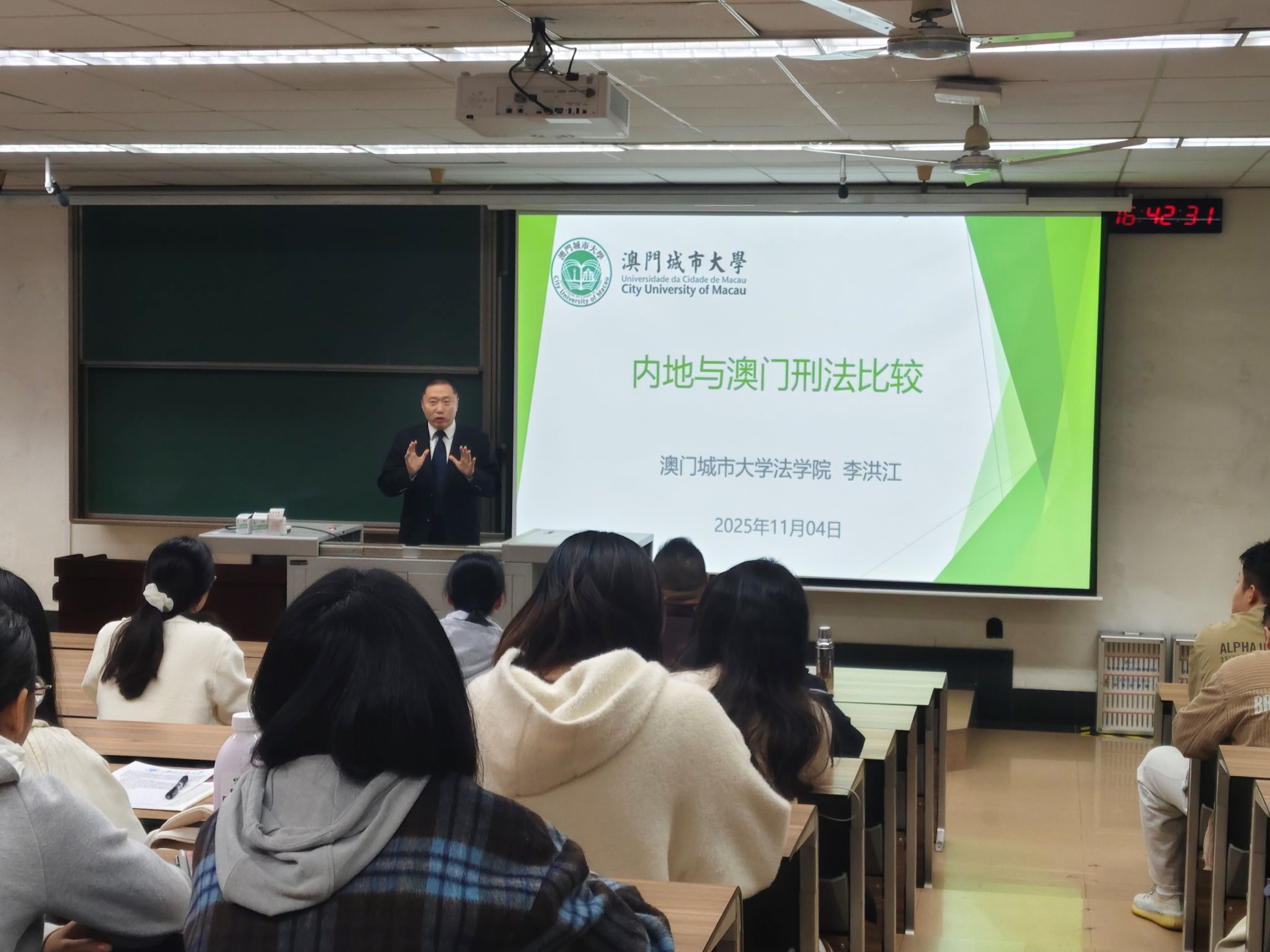 2025年11月4日,澳门城市大学法学院李洪江副教授应邀来到新葡的京官网,作题为“内地与澳门刑法比较”的专题讲座。李洪江副教授现任澳门城市大学校学术委员会委员、澳门城市大学校董会成员、澳门法律改革咨询委员会成员、澳门《法政杂志》主编、澳门金融法律协会副会长、广东省法学会粤港澳大湾区建设港澳法治人才库港澳专家,曾任最高人民法院法官等职。