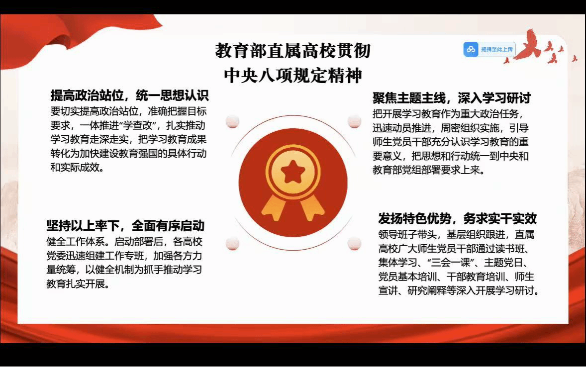 支部全体党员共同学习了人民日报任仲平文章《徙木立信焕发新活力,干净干事创造新伟业——写在全党深入贯彻中央八项规定精神学习教育开展之际》。文章指出,2025年是国家“十四五”规划的收官之年。2025年要高质量完成“十四五”规划设定的目标任务,为实现“十五五”良好开局打好坚实基础,向第二个百年奋斗目标进军。党中央此时决定在全党开展深入贯彻中央八项规定精神学习教育正当其时,意义重大,支部全体同志都应当不打折扣坚决贯彻落实。