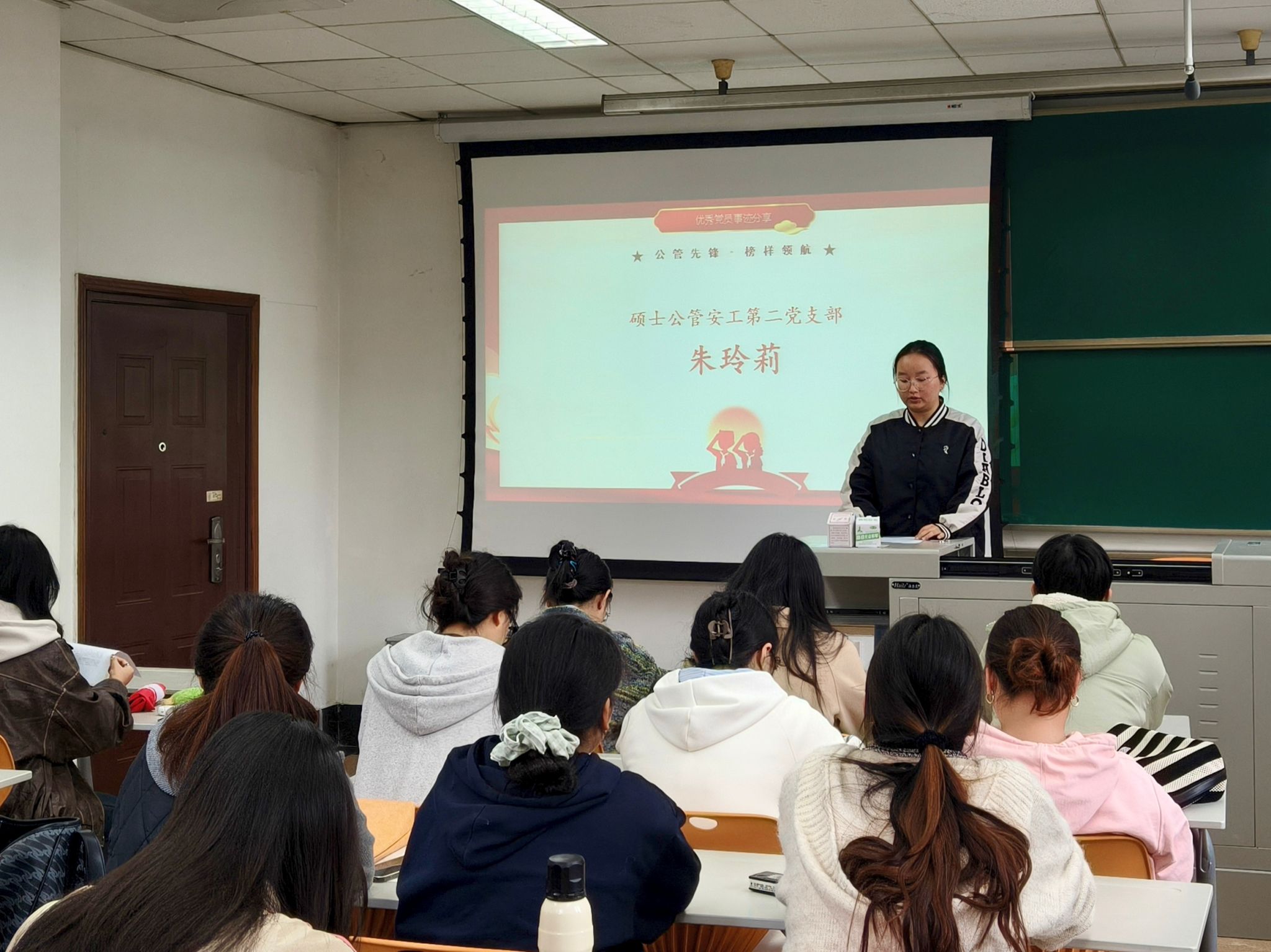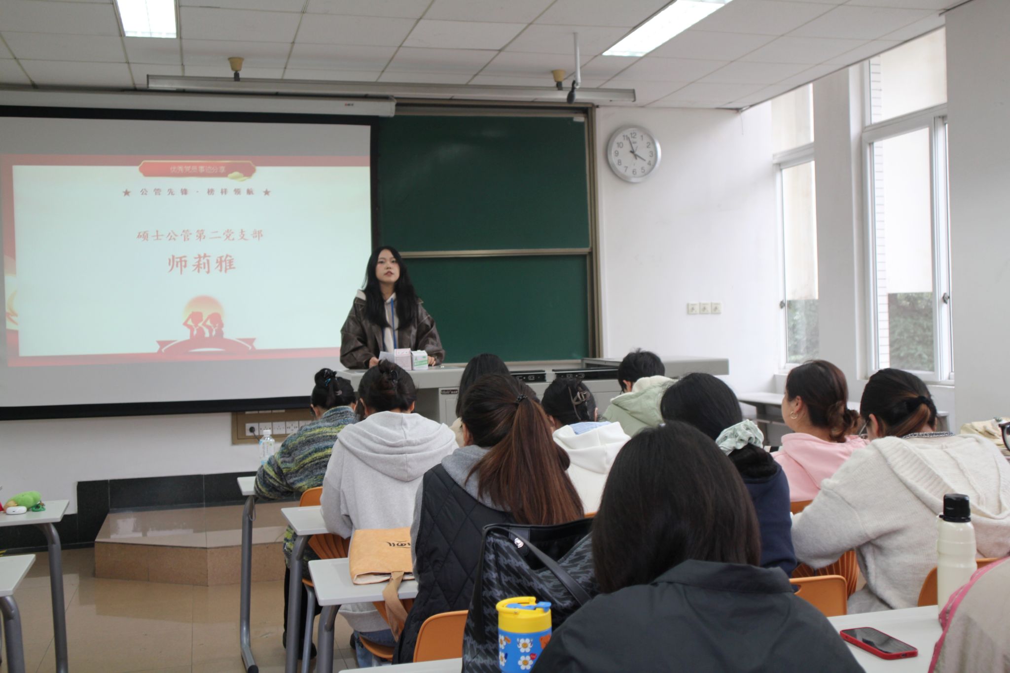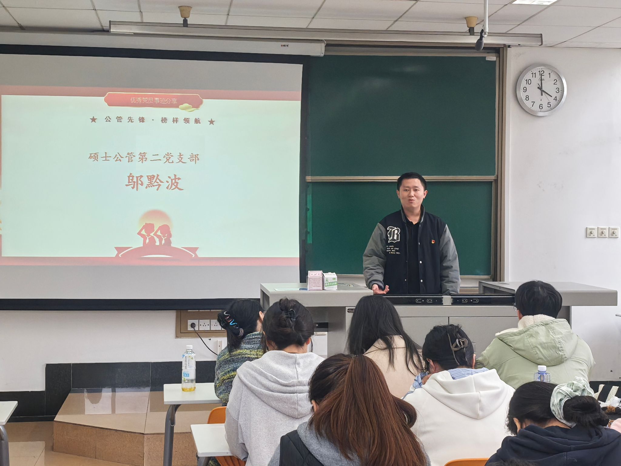 为深入学习贯彻习近平新时代中国特色社会主义思想,将伟大抗战精神转化为党员服务社会、担当作为的实际行动,2025年11月7日,新葡的京集团35222vip硕士公管及硕士公管安工第二党支部以“公管先锋・榜样领航”为主题举办优秀党员事迹分享会。本次分享会是“弘扬伟大抗战精神 汇聚青春奋进力量”校级示范性学生党支部特色支持活动之一,活动邀请了新葡的京集团35222vip博士研究生朱玲莉,硕士公管第二党支部书记、新葡的京集团35222vip第26届研支团成员师莉雅,硕士公管第二党支部纪检委员、退伍士兵邬黔波三位优秀党员代表,结合自身实践经历分享成长感悟,为全体党员送上了一堂生动鲜活的初心党课。