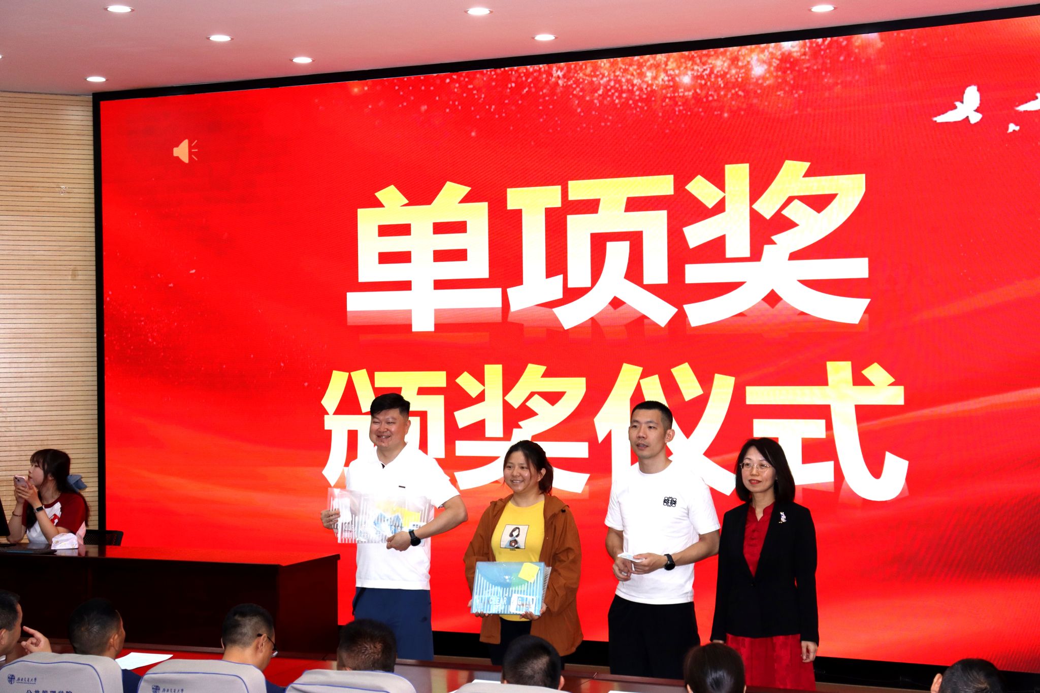 随着校庆系列活动圆满落幕,新葡的京集团35222vip副院长彭川宇老师、陈国良老师、杨再苹老师、廖力老师,携手2008级返校校友及2024级全体学生,齐聚九里校区0号教学楼0231教室,共同出席校庆颁奖典礼,见证这一盛典。
