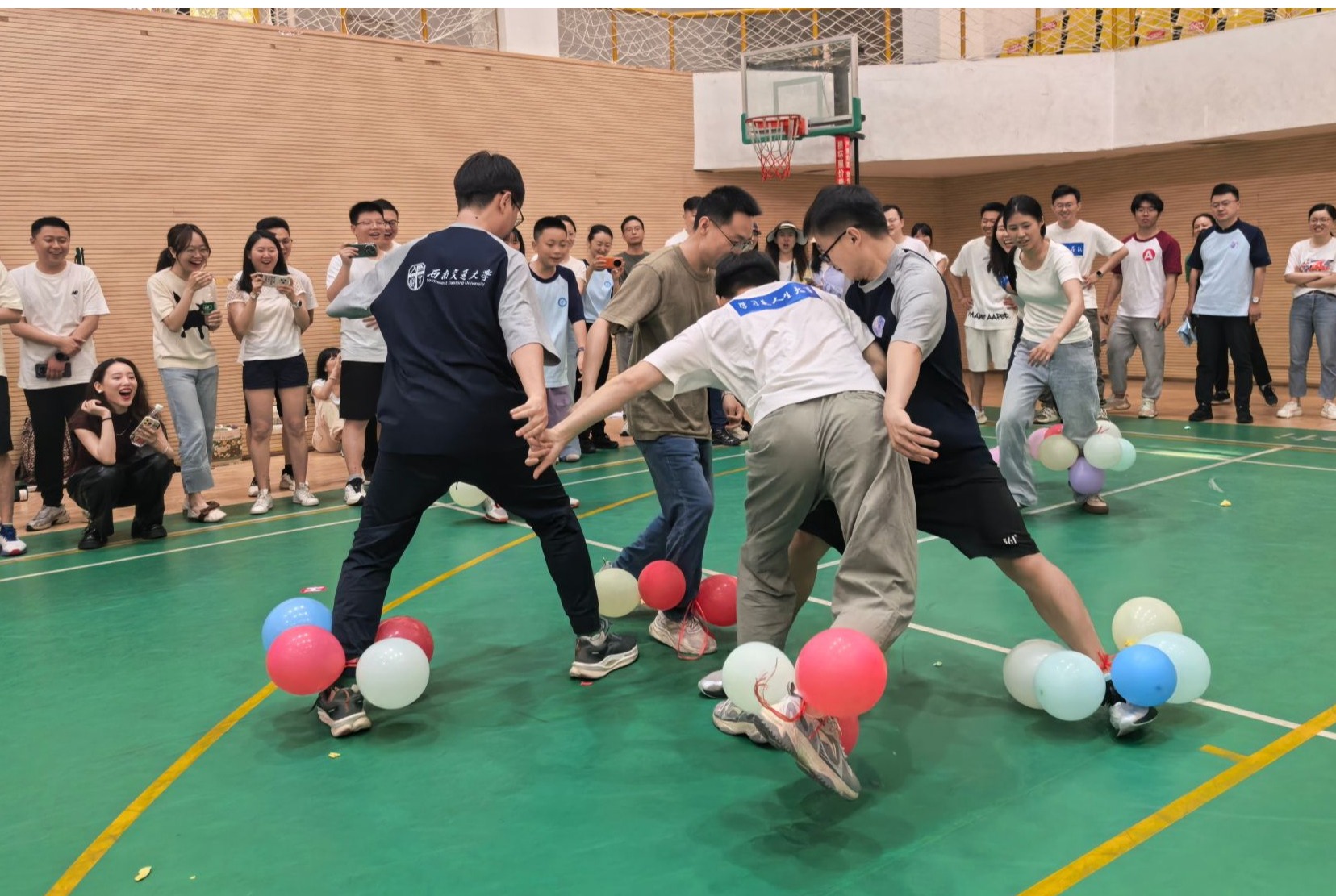 气球保卫战中,参与游戏的队员们右脚绑着气球,在规定区域内灵活移动,既要“进攻”对手,也要保护气球不被踩破,场面妙趣横生、爆笑连连。