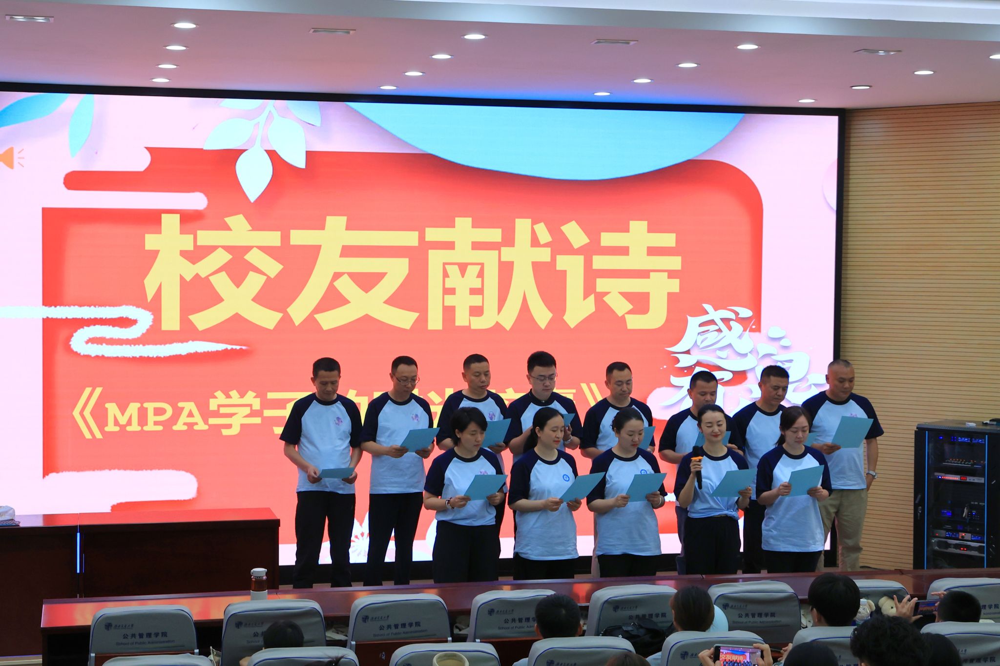 典礼上,彭川宇副院长代表学院致辞,向跨越十六载重返母校的2008级MPA校友致以诚挚谢意与深切祝福,并寄语全体交大人传承“天下为公”精神,共绘新时代发展蓝图。随后,来自中国移动铁通四川分公司 综合部总经理/党委办公室主任,MPA2008级班长陈丰学长作为校友代表发言,并率2008级校友集体朗诵原创诗歌《MPA学子的时光胶囊》,诗歌以“公心为政”为主线,将校友们公共管理领域的躬耕实践与求学时光中的梧桐光影、学堂钟声交织呈现,抒发了对母校的深切眷恋。当全场齐诵“大道之行,天下为公”的铿锵誓言时,十六载未变的母校情谊跨越时空,令在场师生动容。