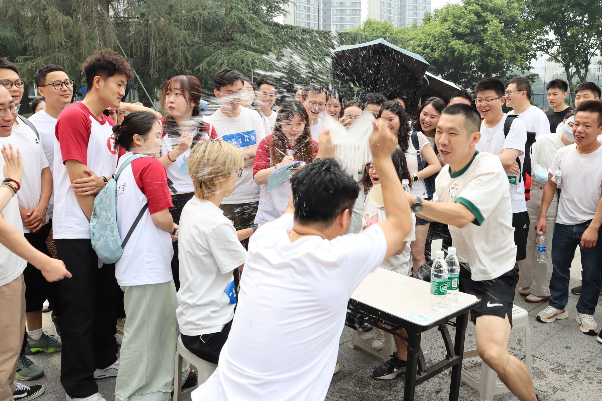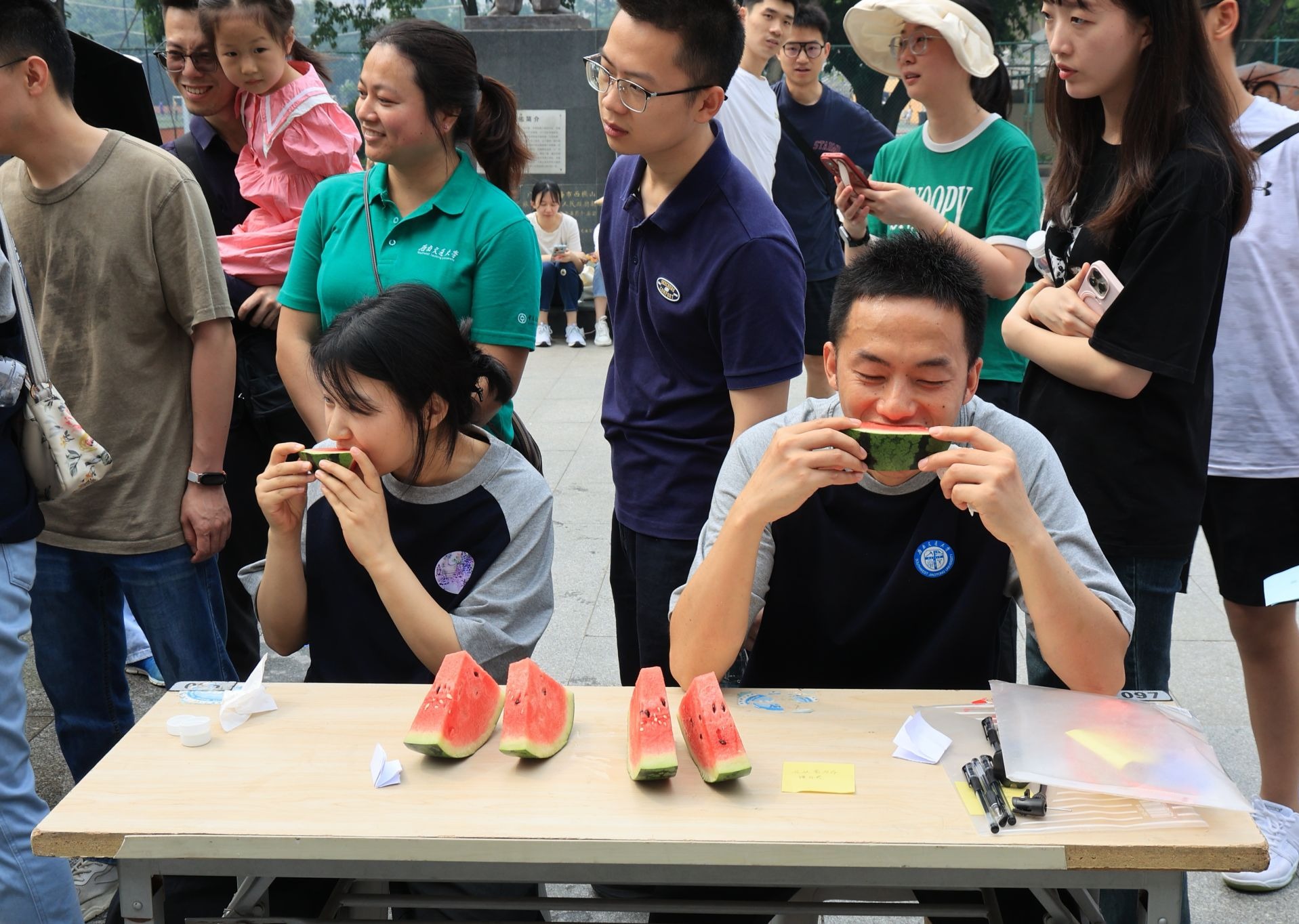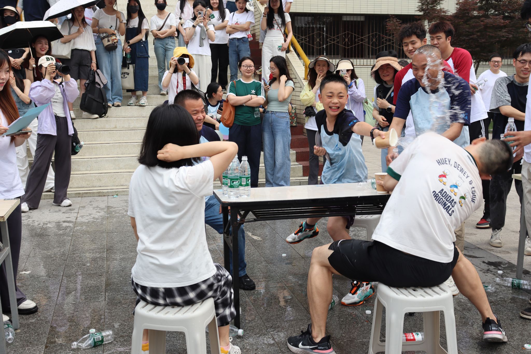 石头剪刀布游戏更是充满趣味,升级版“猜拳”游戏融入水战元素,输方要用搞怪道具防御泼水,创意十足。每队派出的两名队员,一名划拳,一名负责泼水、挡水和添水,双方斗智斗勇,在泼水与防御之间展开精彩博弈。水果消除战则是一片欢乐的“战场”,参赛队员们需迅速吃完规定数量的西瓜,大家抛开矜持,为了团队荣誉全力以赴,比赛场面既紧张又欢乐,充分展现了同学们的活力与热情。